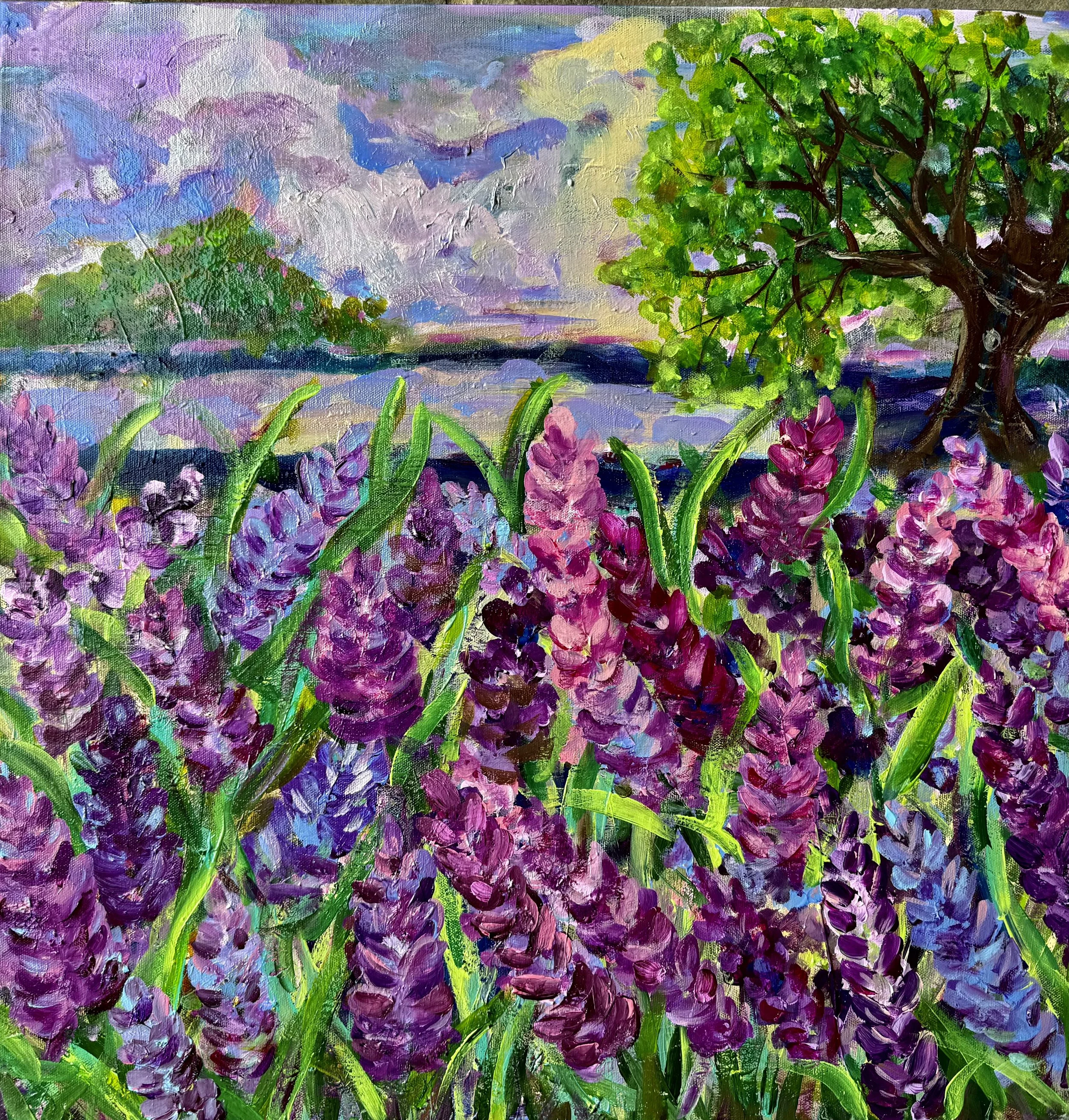 Weiner, Freddi, "Purple Lupines st Sunset", acrylic, 24 x 24", $325