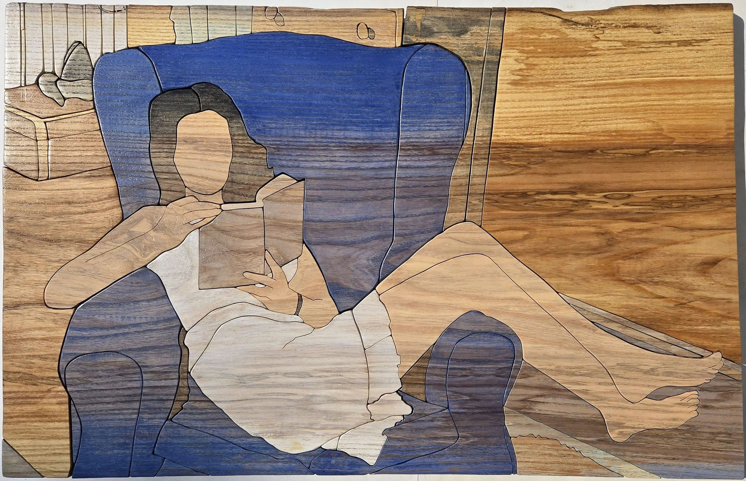 Simon, Carl, "Woman Reading in Chair", Mixed Media: Live edge ash board with acrylic washes (ash tree grew in Montgomery County, MD), 19 x 30", $700
